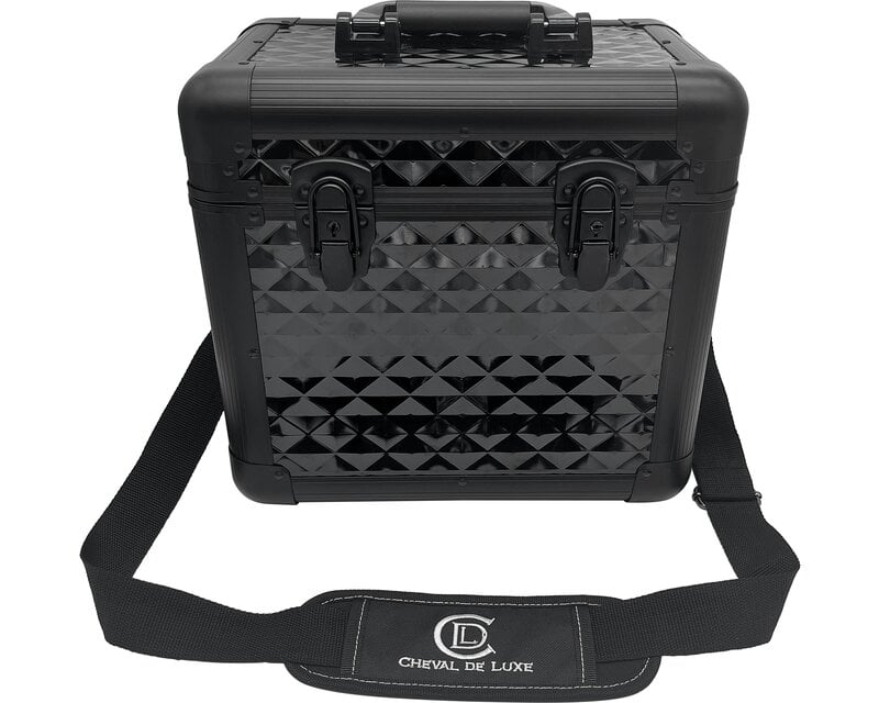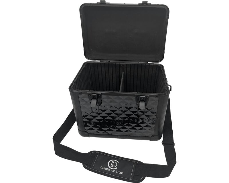 Vysoce kvalitní box na péči o koně od Cheval de Luxe zaujme svou robustní konstrukcí z vyztuženého plastu a dřevovláknité desky s robustním hliníkovým rámem. Pěnová výstelka tlumící nárazy spolehlivě chrání obsah. Velkorý úložný prostor nabízí místo pro produkty péče o koně a umožňuje skladování i vysokých lahví ve svislé poloze, zatímco flexibilně nastavitelná přepážka udržuje vnitřní prostor uklizený. Dva U-zámky, robustní rukojeť a praktický ramenní popruh dělají z tohoto boxu ideálního společníka pro každodenní použití ve stáji i na soutěžích.