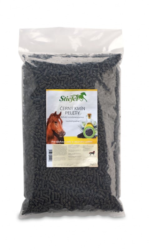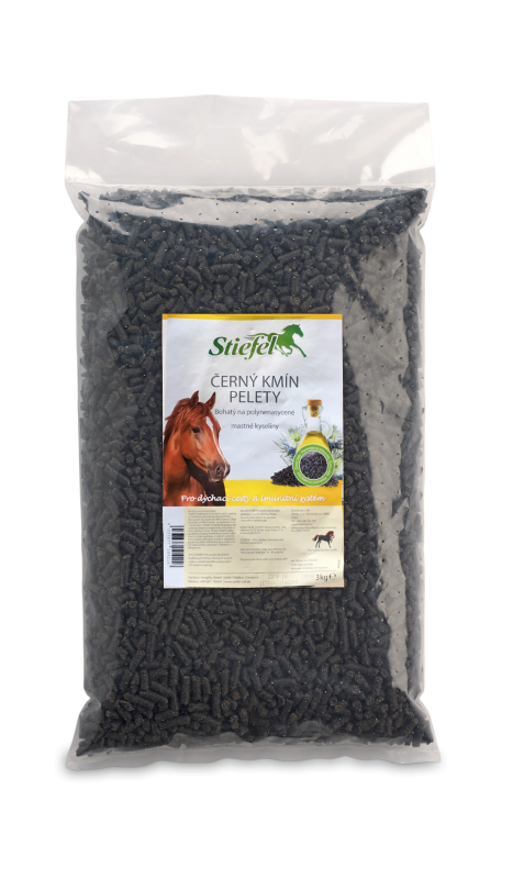 Olejová složka je u produktu Černý kmín pelety díky šetrnému lisování za studena mírně redukována asi o třetinu. Stiefel Černý kmín může podporovat obranyschopnost organismu, kůži a srst i dýchací cesty. Použijte i jako podpůrný krmný doplněk pro koně s ekzémem či letní vyrážkou. Peletky koně v krmné dávce dobře přijímají. V nabídce máme také 100% za studena lisovaný olej z černého kmínu.