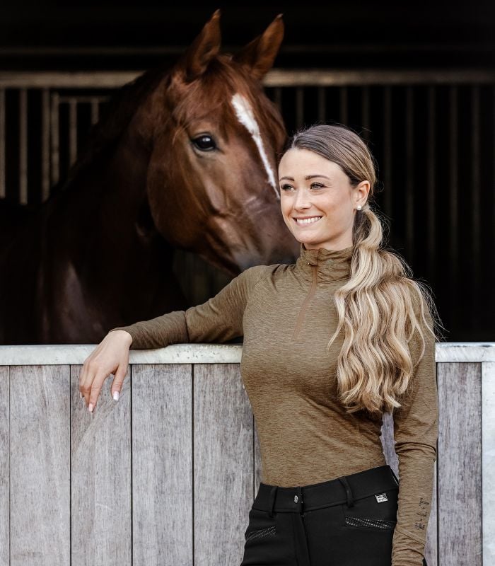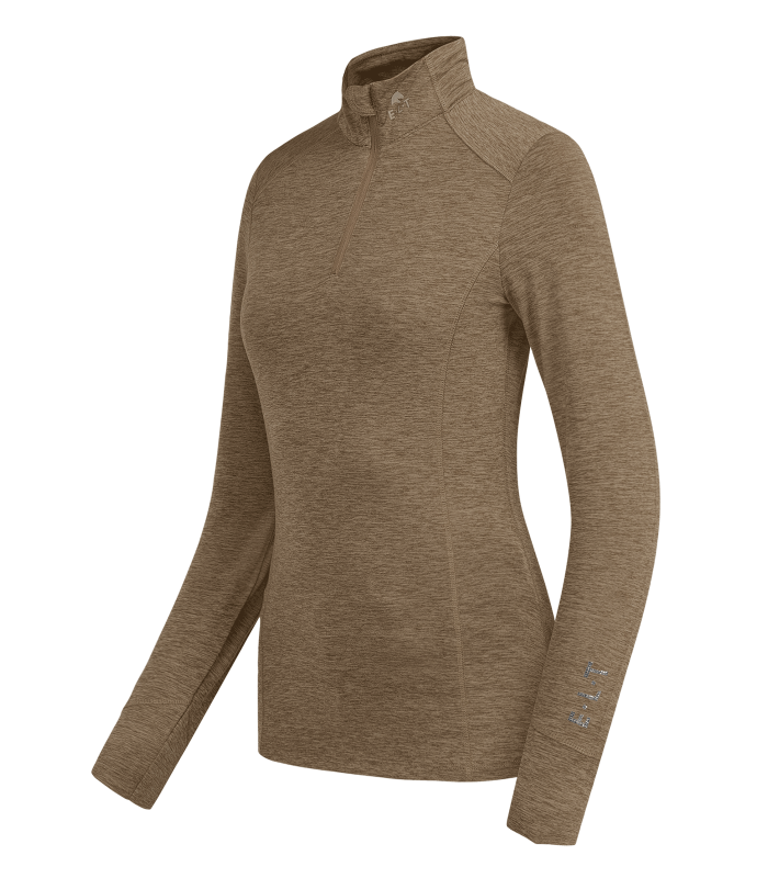 Dámské, kvalitní funkční triko s dlouhým rukávem na zip - Přiléhavý tvar - Prodyšný funkční materiál - Přední zip se skrytým zipem - Ozdobná páska v oblasti krku - Vysoký límec s potiskem loga - Nápis ELT s ozdobnými decentními kamínky na rukávu.
