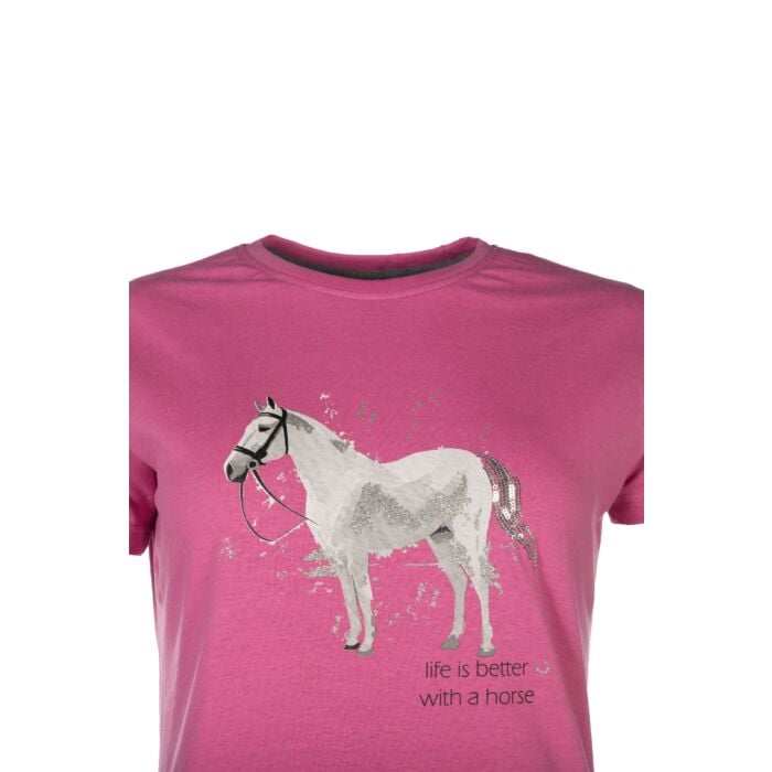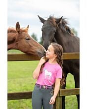Dětské tričko Sparkle je perfektní top pro malé fanoušky koní! Vyrobeno ze 100% bavlny šetrné k pokožce, pohodlné na nošení a prodyšné - ideální dny strávené ve stáji nebo na hřišti. Vrcholem trička je krásný potisk s motivem koně, který je zdobený třpytivým potiskem a krásnou výšivkou s flitry. To promění každý outfit v opravdový poutač! Ať už na koni nebo ve volném čase – s tričkem Sparkle mohou děti stylově vyjádřit svou lásku ke koním