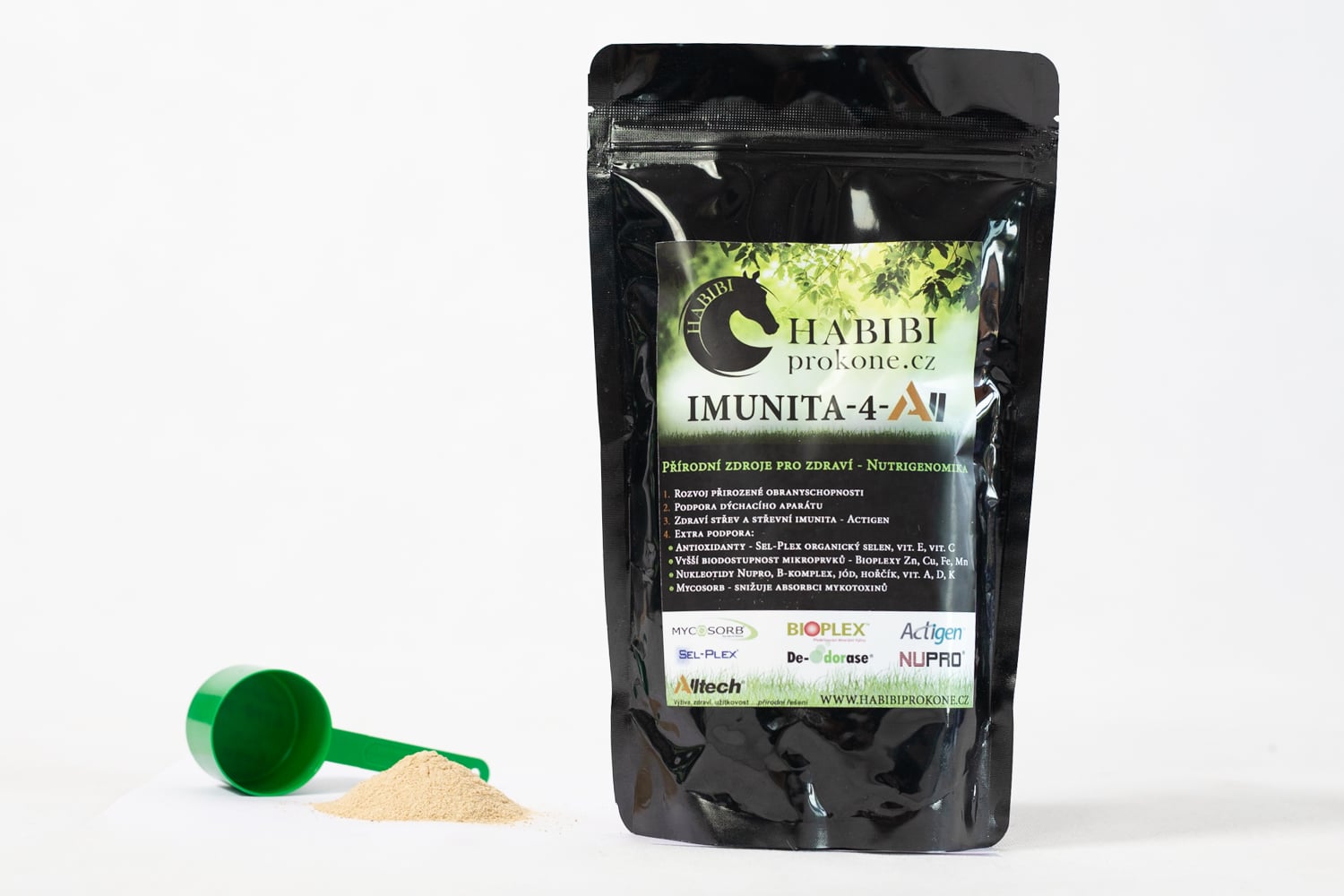 Způsob užívání: Zamíchejte do zvlhčeného krmiva, do jogurtu nebo do nápoje. Pro zvýšení chutnosti možno dochutit oblíbenou složkou potravy. Pro nejlepší efekt podávajte alespoň po dobu 6 - 8 týdnů. Je možno podávat i dlouhodoběji. U malých zvířat (pes, kočka) a hříbat pod matkou stačí Habibi IMUNITA-4-All jako jediný doplněk vitamínů a minerálů. U odstavených hříbat, rostoucích mladých koní a u dospělých koní doporučujeme podávat Habibi IMUNITU-4-All jako doplněk k základní minerální směsi Habibi-Organika. Pokud kůň odmítá novou chuť a aroma, začněte podáváním menších dávek v oblíbeném krmivu a zvlhčováním studenou vodou (teplá uvolňuje aroma více). Odmítání nových aromat a chutí je přirozená reakce koně na neznámé složky krmné dávky a Váš kůň potřebuje čas na zvyknutí.
