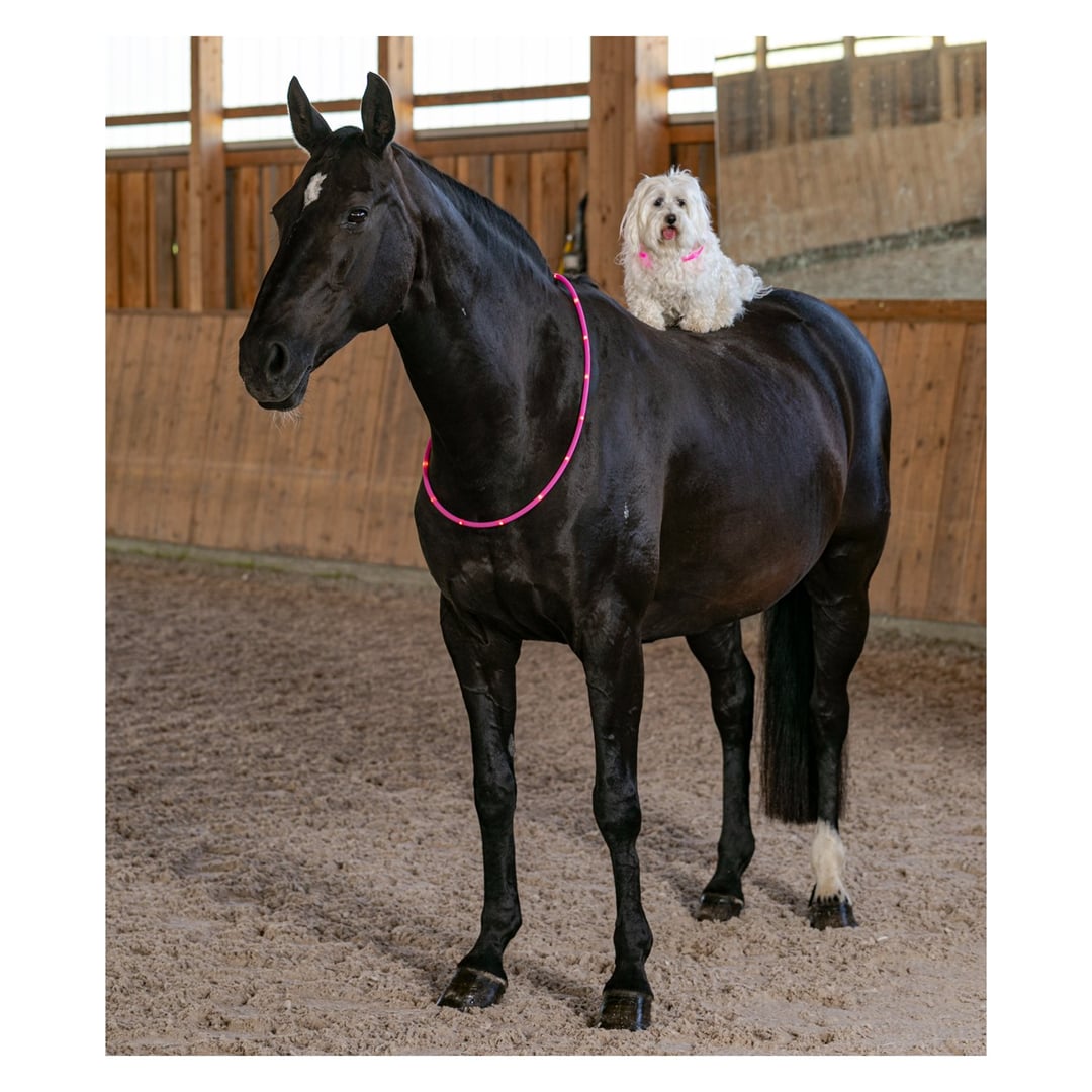 LED řemínek na krk je vysoce kvalitní a lehký. Led řemínek je velmi pohodlný a praktický a především zajišťuje viditelnost vašeho koně ve tmě. Lze jej upravit na správnou velikost přeříznutím mezi dvěma LED. Můžete si vybrat mezi 2 úrovněmi blikání a trvalým světlem. Doba svícení je až 3 hodiny (v závislosti na nastavení). Led řemínek lze pomocí dodaného kabelu USB snadno dobít přibližně za 1,5 hodiny.