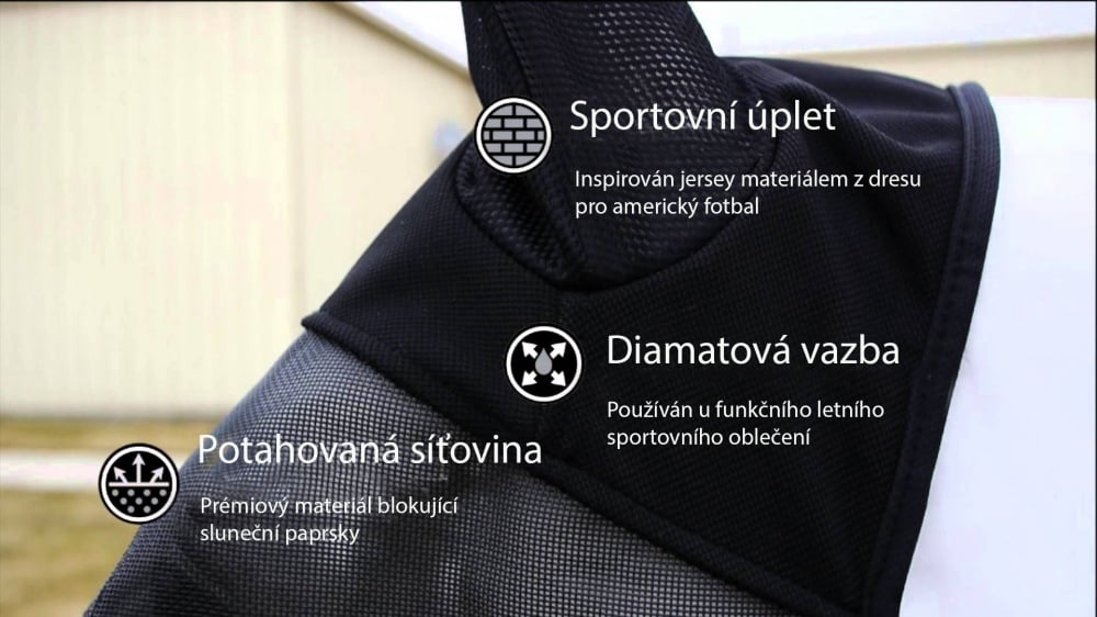 Náš nejnovější design masky proti hmyzu představuje nový standard masek. Díky použití high-tech materiálů, původně vyvinutých pro funkční oblečení sportovců v nejnáročnějších podmínkách, můžeme nyní v sezoně hmyzu udržet své koně v chladu, suchu a komfortu. Tato pohodlná tkanina skvěle odvádí vlhkost a pruží pouze ve dvou směrech, díky čemuž dobře sedí.