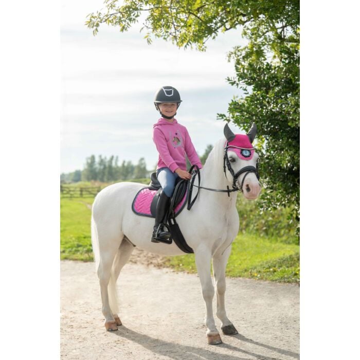 Krásná, kvalitní podsedlová dečka pro shetlandské poníky. Zdobena je paspulkou a kokardou. Kokarda je odnímatelná pomocí suchého zipu. Pod kokardou je suchý zip ve tvaru srdíčka. Dečka má poutka k sedlu na suchý zip a klasická poutka na podbřišník. Pěnová a vatová výplň zaručuje rovnoměrné rozložení tlaku