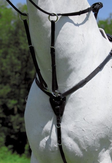 Poprsník z pevné kůže s elastickou vsuvkou v nákrční části. Odnímatelné martingalové vidlice. Barva černá, velikost full a pony.