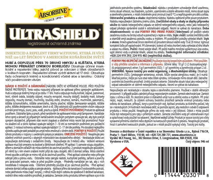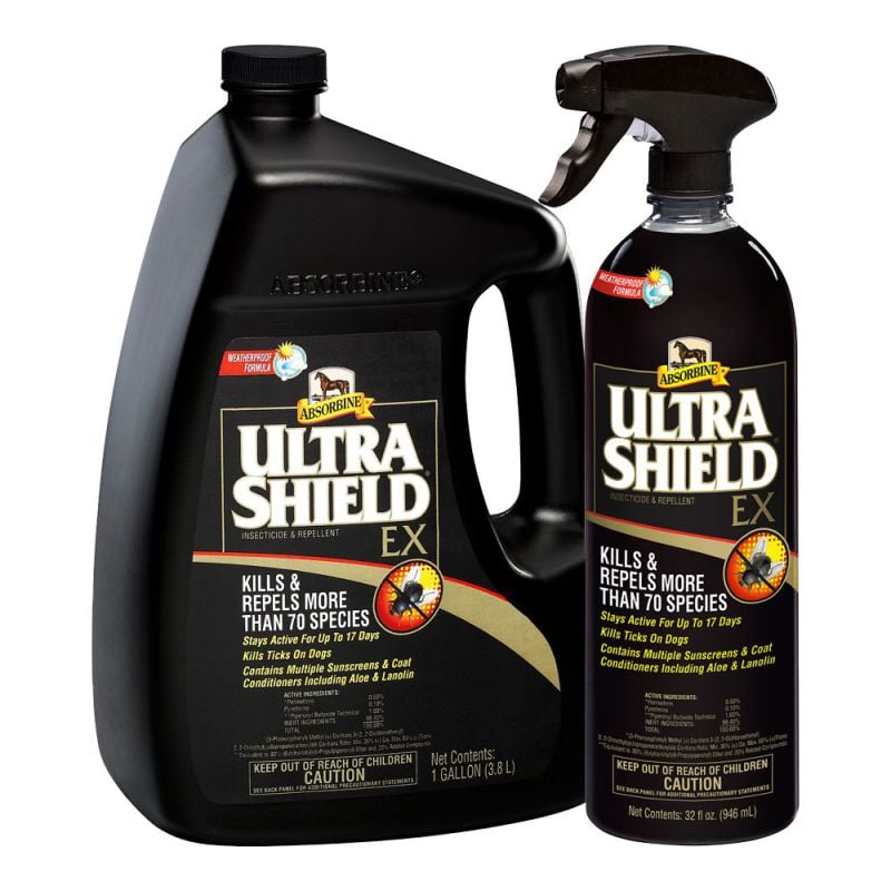 UltraShield® EX Insecticide & Repellent se nevypotí, je voděodolný, nemastný a jeho prodloužený účinek, běžně zajišťovaný tzv. slunečními krémy pod různými obchodními názvy, je zde posílen použitím rovnou dvou takových. Obsahuje také výtažky z aloe a lanolinu. Odpuzuje a zabíjí široké spektrum hmyzu, od otravných much a mušek, přes moskyty, komáry, pakomárce (Culicoides), klíšťata, blechy, kloše, muchničky, tiplíky, vši...