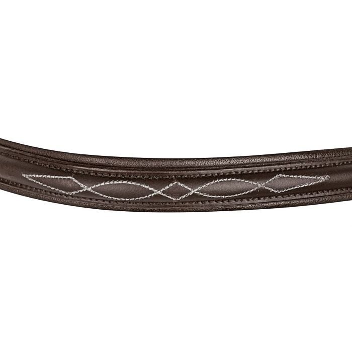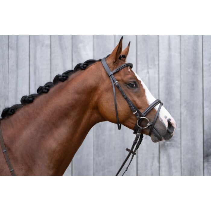 Uzdečka s anglickým kombinovaným nánosníkem vyrobená z kvalitní kůže. Vybavena měkce podloženým nánosníkem a čelenkou. Opatřena kováním v matně stříbrné barvě. Součástí jsou plátěné otěže s koženými zarážkami.