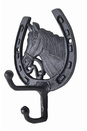 Černý litinový držák na uzdečky s koňskou hlavou.