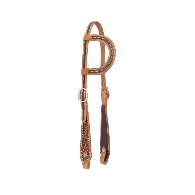 Krásná uzdečka na jedno ucho, která je ideální na výcvik i na závody. Tato westernová jednouška zaujme svým krásným květinovým vzorem. Elegantní uzdečka s jedním uchem je zdobena krásnými obdélníkovými přezkami, které mají také šik vzor. Skvěle jsou nerezové pecičky na uchu a lícnicích. Květinový vzor a zbarvení dělají z uzdečky skutečný klenot!