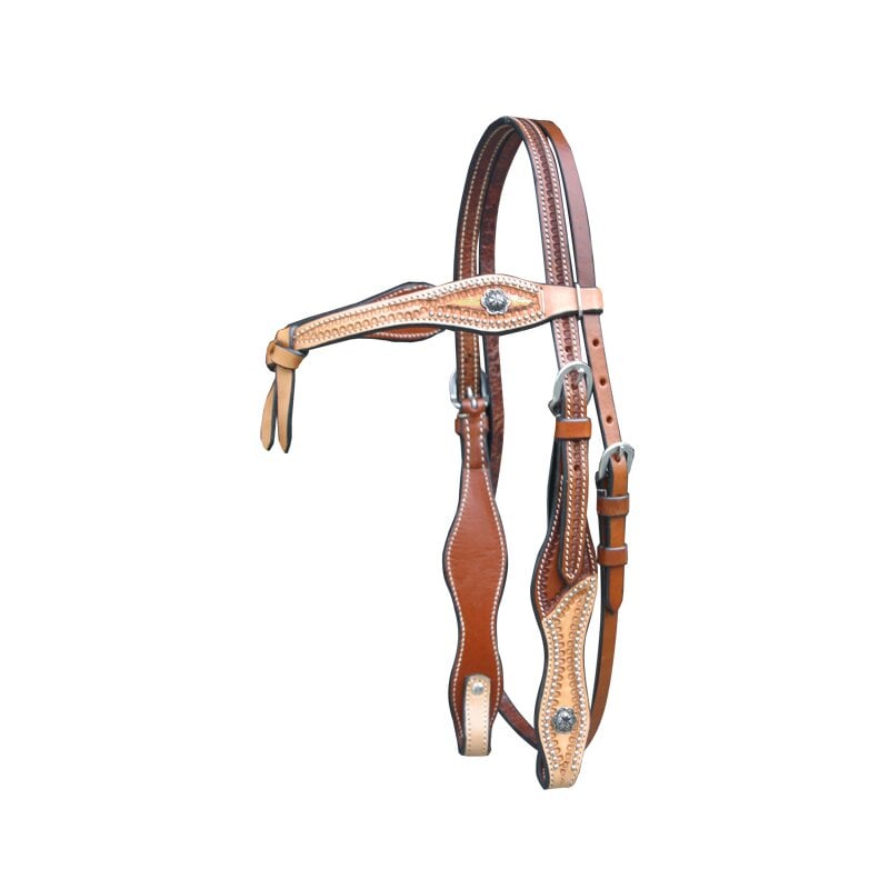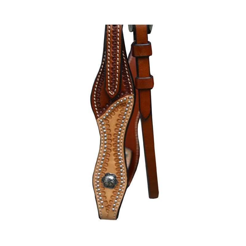 Výjimečná čelenka ve dvou odstínech hnědé s elegantní čelenkou do V. Uzdečka zaujme i neobvyklou barevnou kombinací světlých a tmavě hnědých tónů. Tento westernový kousek upoutá pozornost každého!