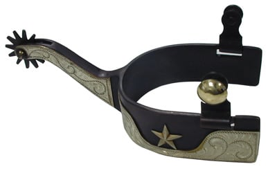 Westernové ostruhy z hnědého železa s ručním rytým zdobením.