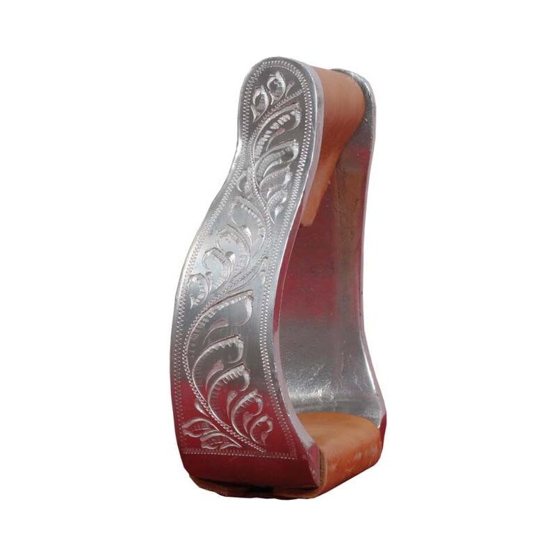Gravírované hliníkové třmeny s koženým potahem. Zakřivený třmen má na vnější straně krásné gravírování.