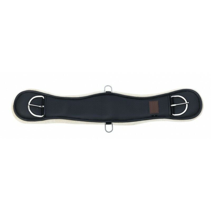 Westernový podbřišník anatomického tvaru pro koně, vyrobený z polyuretanu, podšitý umělým beránkem.. Ocelové přezky na obou koncích a 2 ocelové přezky (D kroužky) pro tréninkové potřeby.